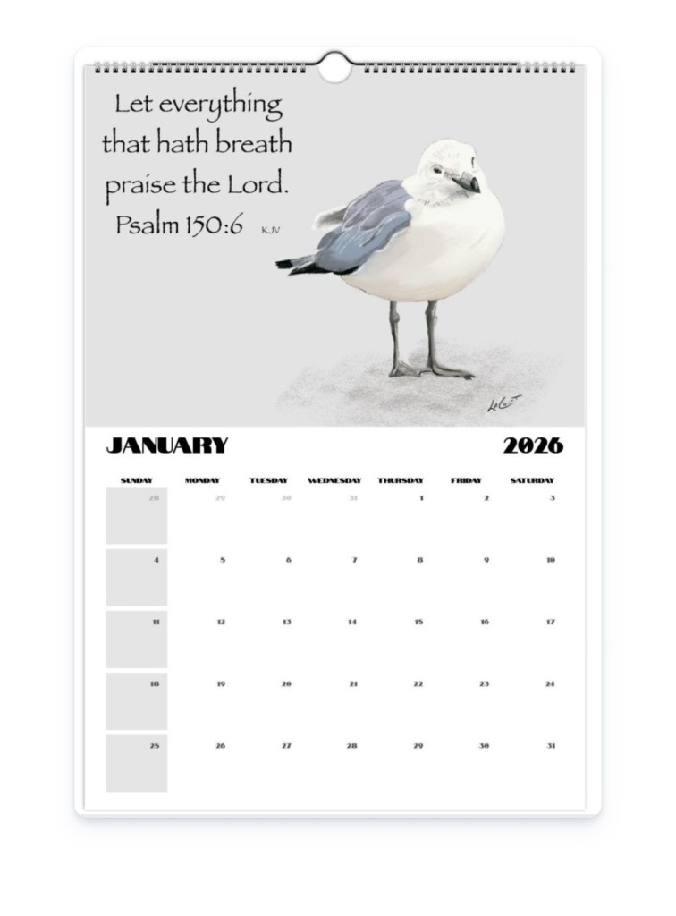This past spring I had one of those nights when I could not sleep. I began thinking about the 2026 wall calendar and the title Birds of Praise 2026 Inspirational Calendar by LaCount Anderson was born. All through the spring and summer I discovered birds and had an enjoyable time creating paintings of these beautiful birds. Each month also has a verse from the Psalms to serve as inspiration to the viewer throughout the coming year.